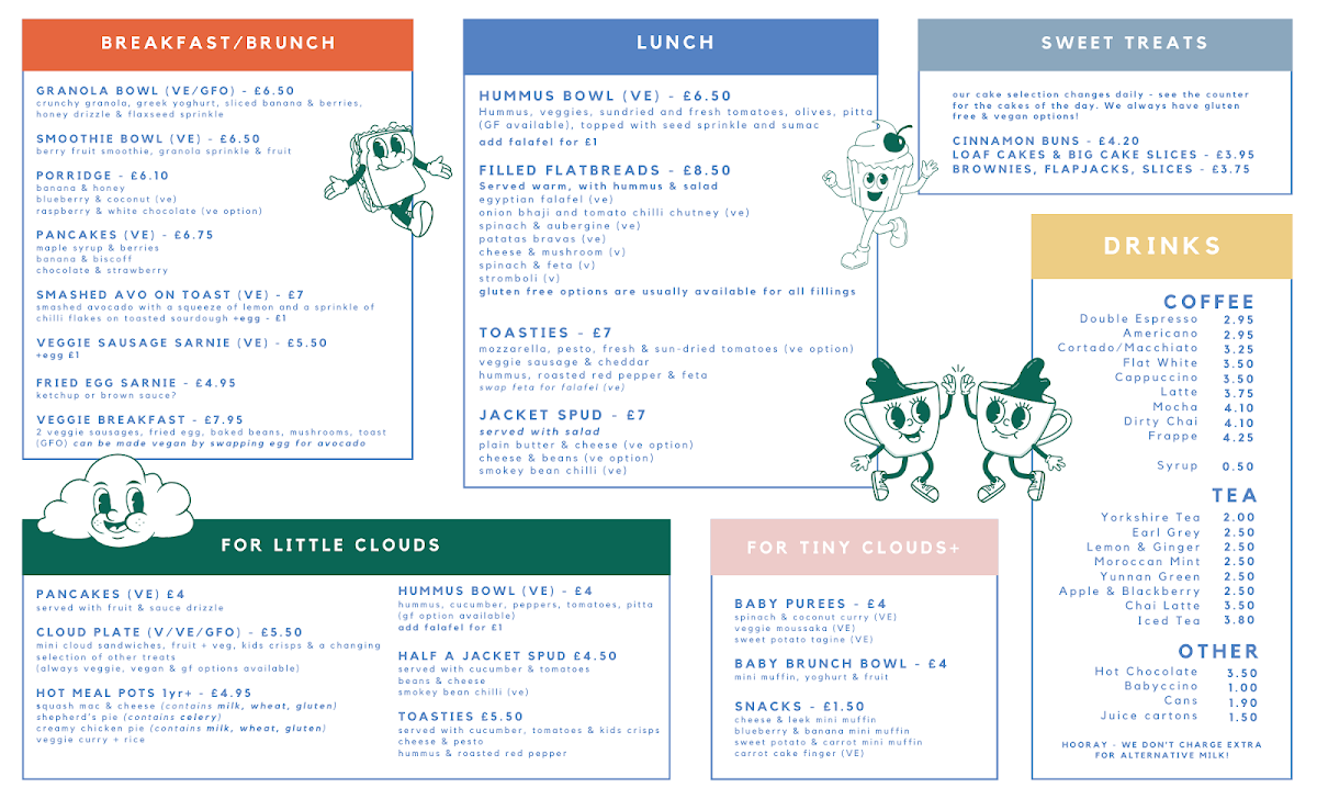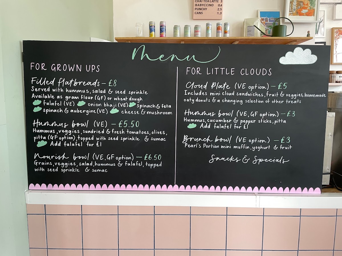 The menu is carefully curated to cater to different tastes and dietary needs. Among the highlights are indulgent options such as the rich Mocha (£4.10) and the versatile Dirty Chai (£4.10), ensuring that every coffee lover finds their perfect brew. Not to be overlooked is the Hummus Bowl, a delicious and nutritious offering for the tiny clouds indulging in a snack, capturing the essence of healthy eating amidst playtime. Trust us, after a fun-filled adventure, you'll want to treat yourself to one of their mouth-watering cakes, highly praised by regular customers!